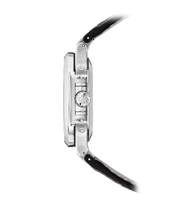 Parlatılmış çelik kasa, yumuşak geçişli yüzeyleri ve geniş çerçevesiyle güçlü bir siluet oluşturuyor. Siyah timsah derisi kayış, modele hem prestijli hem de rafine bir hava katıyor. Tarih penceresi simetrik formu koruyarak işlevsel zarafet sunuyor.