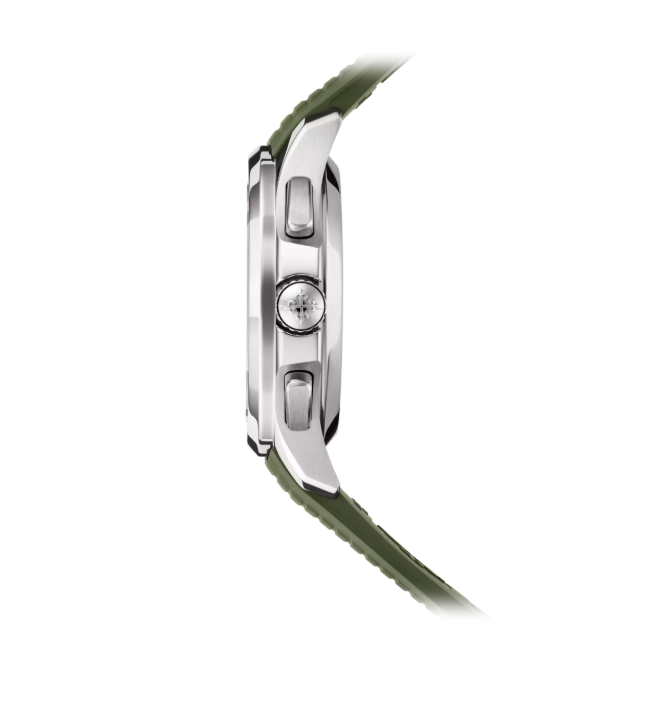 Olive Military Sport Edition; Patek Philippe Aquanaut tasarımının sportif ruhunu modern askeri yeşil tonuyla yeniden yorumlayan, prestijli ve özgün bir modeldir. Mat zeytin yeşili kadran, ışıltıya göre değişen tonlarıyla güçlü bir derinlik etkisi yaratır. Beyaz indeksler ve net okunabilir rakamlar, sade ve elit bir görünüm sunar.