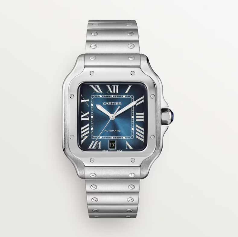 Santos-Style Blue Edition, Cartier’nin ikonik kare kasa tasarımını modern bir mavi sunburst kadranla buluşturan prestijli bir saat modelidir. Derin mavi tonların ışığa göre değişen yansımaları, klasik Roma rakamlarıyla birleşerek eşsiz bir zarafet oluşturur. Kadranın merkezindeki dikey fırçalanmış iç kare detayları, tasarıma sofistike bir mimari derinlik katar.