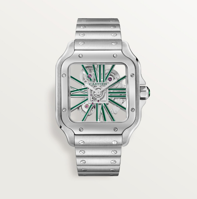 Cartier’nin ikonik Santos DNA’sını tamamen modern bir yorumla sunan Emerald Skeleton Edition, tamamen açık iskelet yapısıyla mekanizmayı tüm ihtişamıyla sergiler. Kadranın etrafına yerleştirilmiş yeşil Roma indeks çubukları hem yapısal hem sanatsal bir görünüm kazandırır.