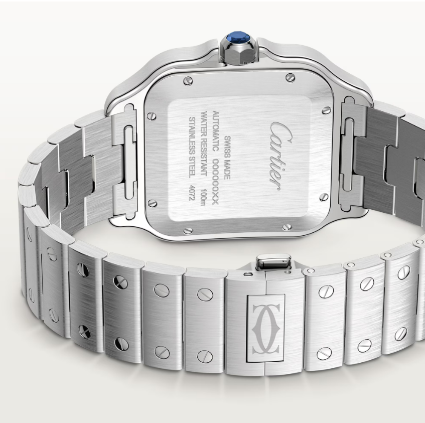 Parlak-saten geçişli çelik kasa ve vidalı bezel, ikonik Santos görünümünü tamamlar. Silver sword-style ibreler yüksek okunabilirlik sağlarken, mavi cabochon taşlı taç modele karakteristik bir Cartier dokunuşu ekler. Saat 6 yönündeki tarih penceresi simetrik yapıyı kusursuzca korur.