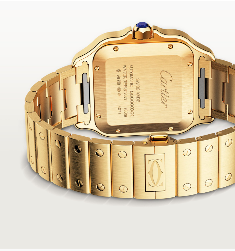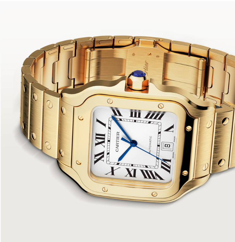 Cartier Santos-Style Gold Edition, ikonik kare kasa formunu bu kez sıcak altın tonlu gövde ve zarif beyaz Roma kadran ile bir araya getiriyor. Fırçalanmış ve parlak yüzey geçişleri, ışık altında dikkat çekici bir kontrast oluşturuyor ve saate üstün bir lüks hissi kazandırıyor.