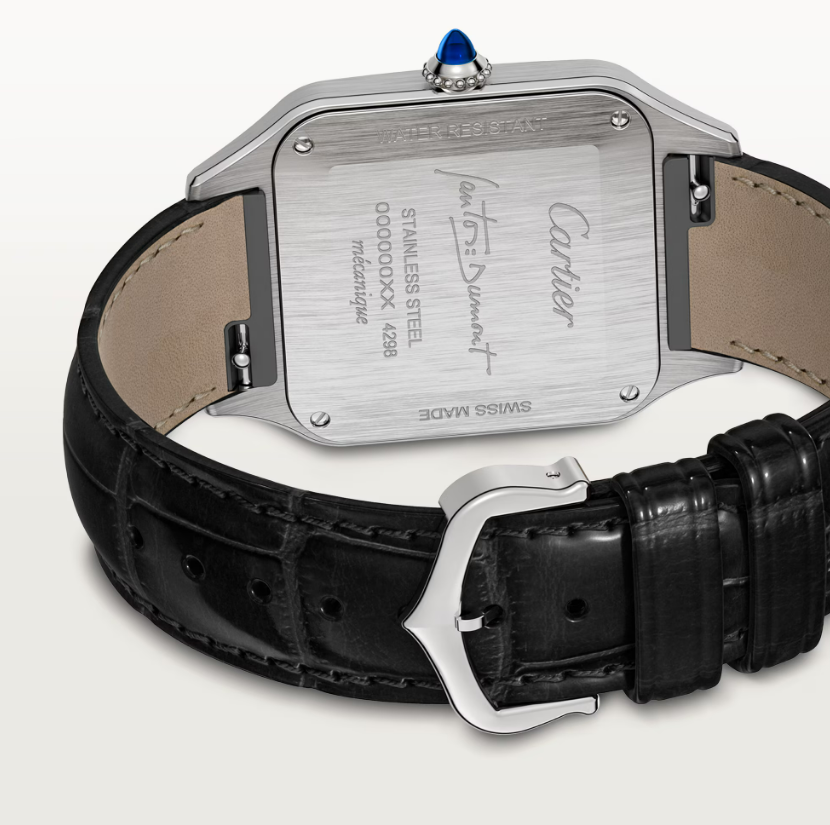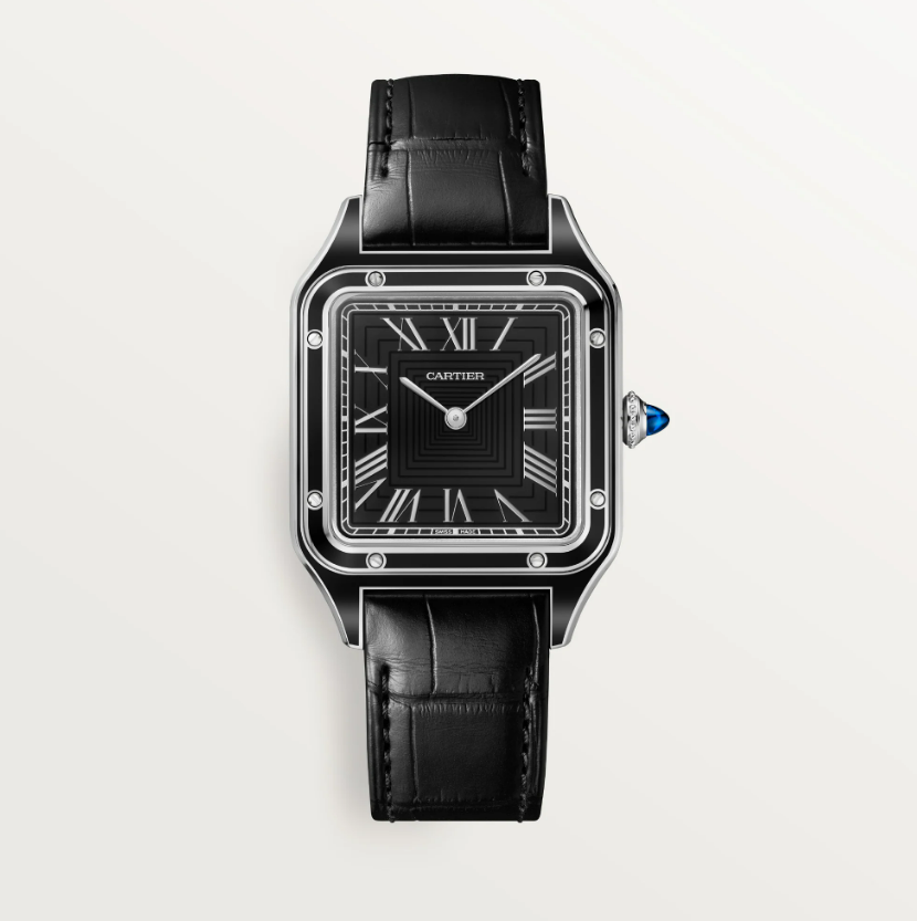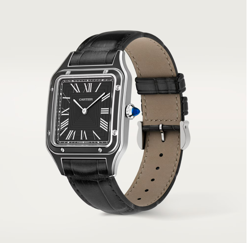 Parlak siyah kadranın üzerine yerleştirilmiş beyaz Roma rakamları, klasik Cartier DNA’sını güçlü biçimde yansıtır. İnce silver sword-style ibreler, sade ama sofistike bir görünüm sunar. Mavi taşlı taç, modelin premium kimliğini tamamlayan ikonik Cartier dokunuşudur.